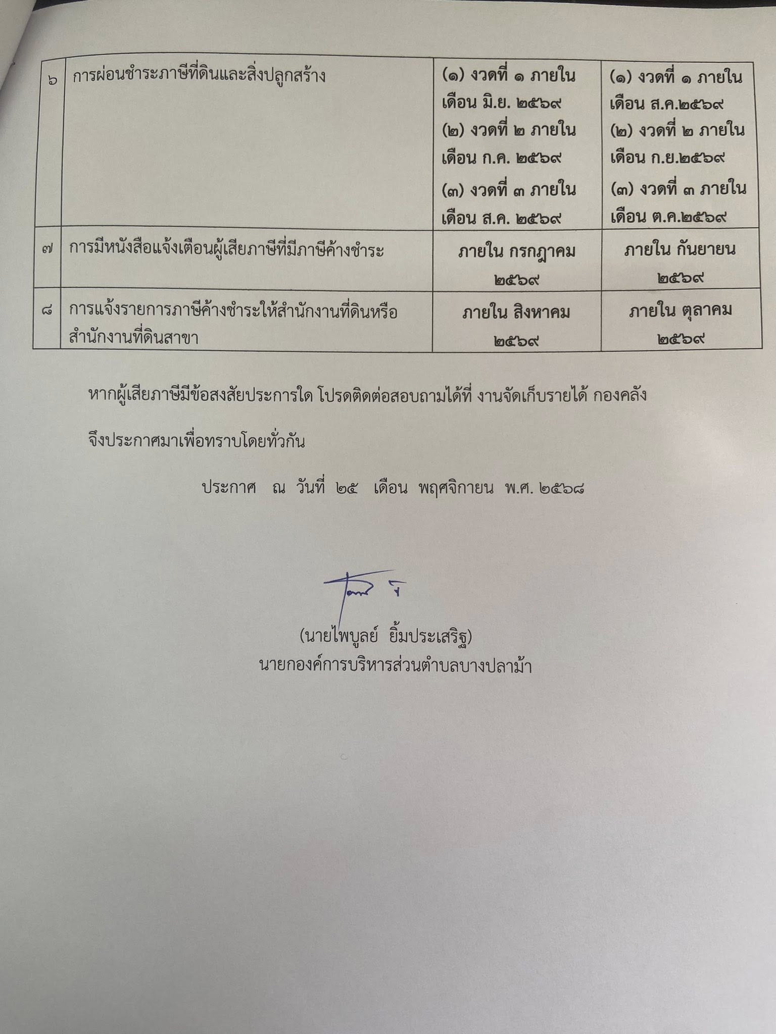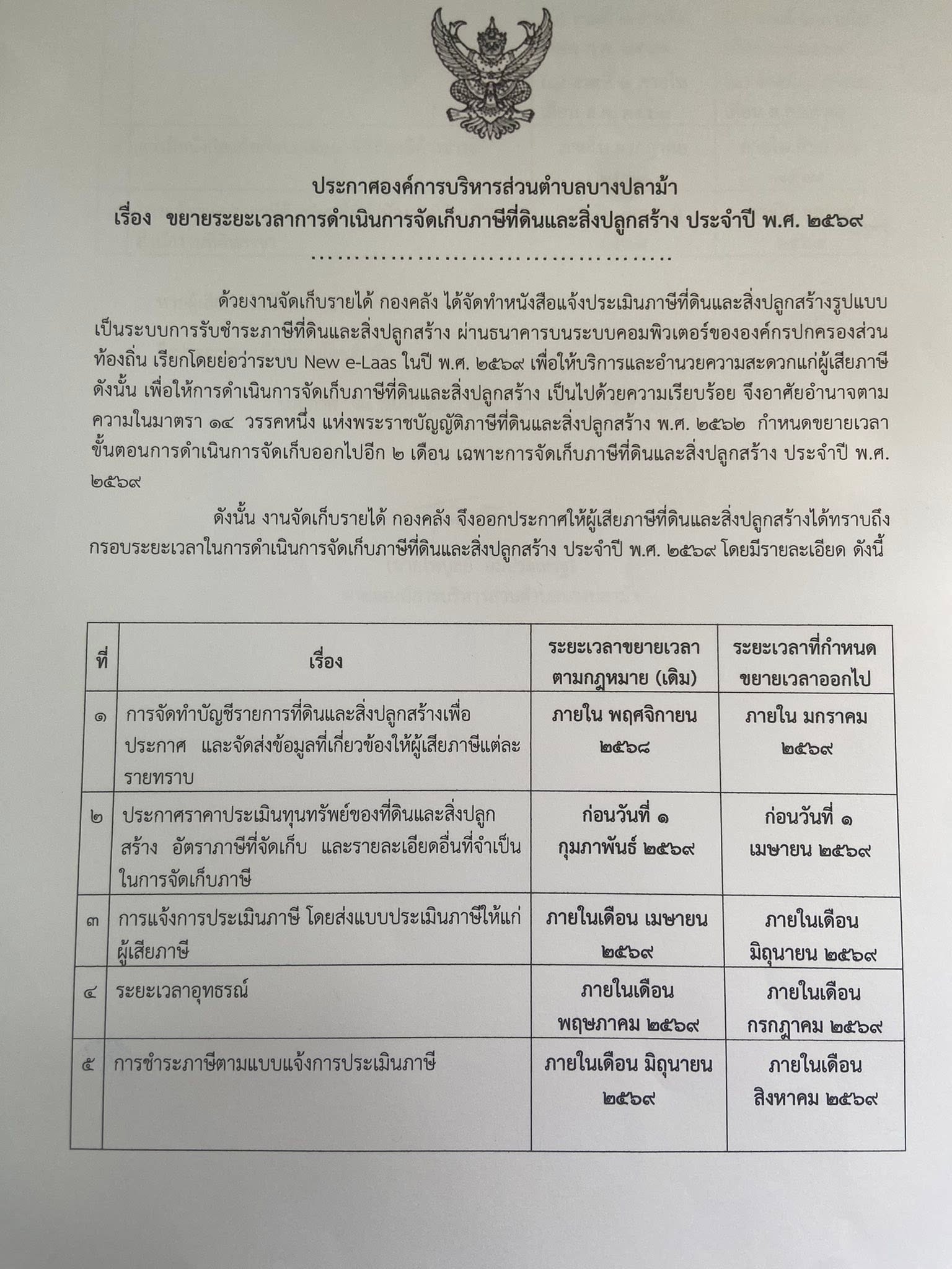 ประกาศขยายเวลาจัดเก็บภาษีที่ดินและสิ่งปลูกสร้าง ประจำปี 2569